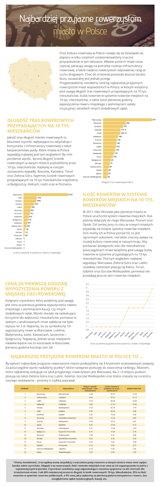 Na ogólną ocenę satysfakcji z warunków jazdy rowerem w danym mieście może mieć wpływ bardzo wiele czynników. Długość tras rowerowych, ilość rowerów miejskich oraz cena za ich wypożyczenie to jedne z najistotniejszych kryteriów. Zespół ShopAlike  przygotował ranking najbardziej przyjaznych rowerzystom miast w Polsce, w którym zostały wzięte pod uwagę następujące parametry: