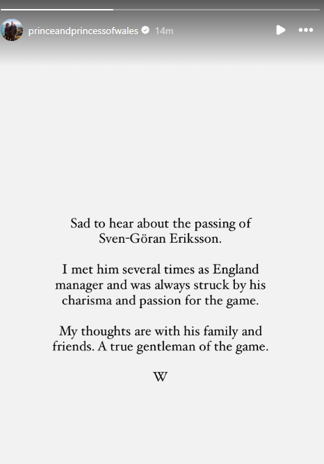 Wśród osób, które złożyły hołd Erikssonowi, znalazł się książę William, prezydent Angielskiego Związku Piłki Nożnej (FA), który podkreślił charyzmę i pasję Svena do gry.