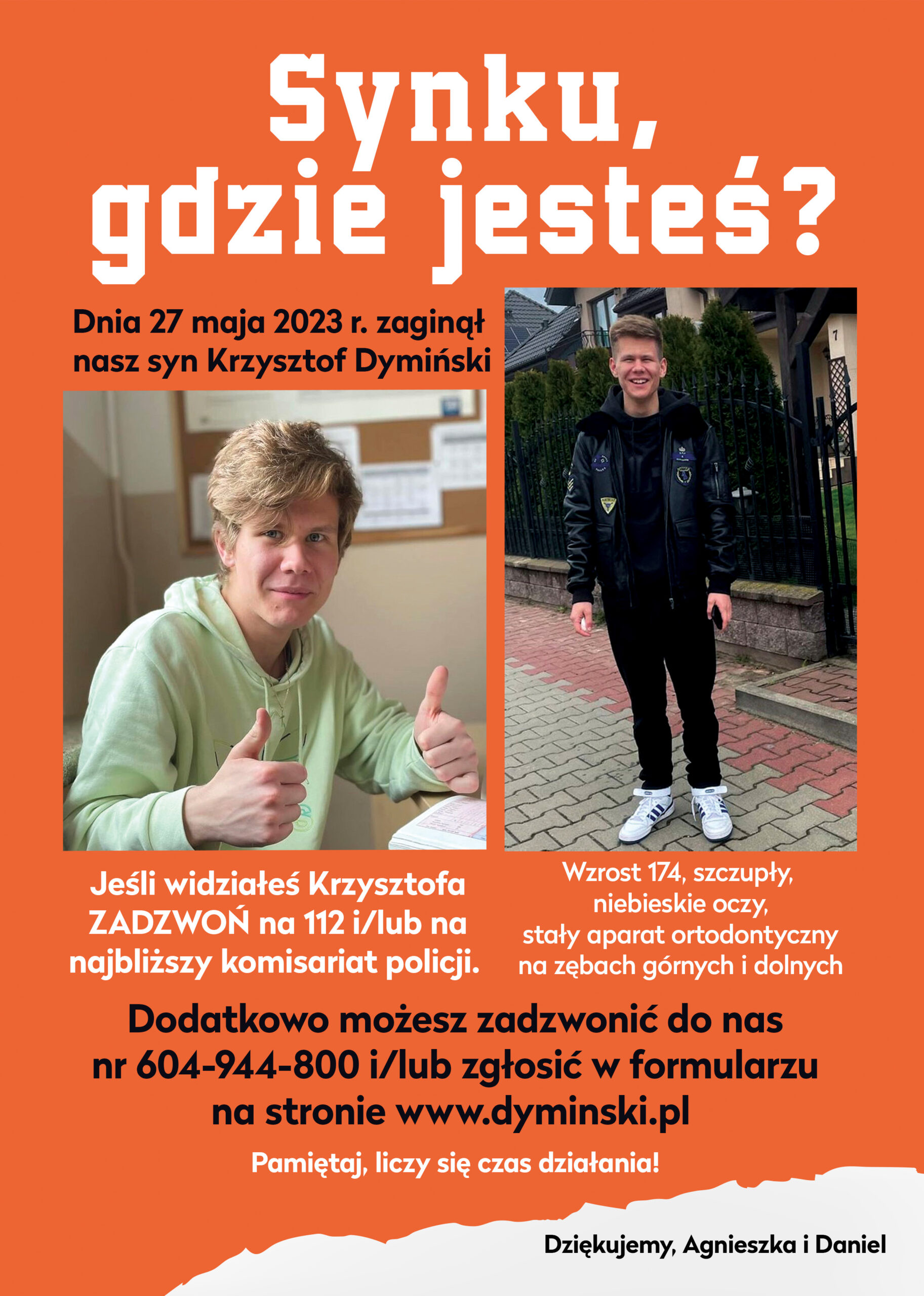 Krzysztof Dymiński zaginął dwa lata temu. 27 maja 2023 roku nad ranem wyszedł na autobus w miejscowości Pogroszew Kolonia i wsiadł do autobusu kierującego się w stronę Warszawy. W stolicy udał się w stronę partu Traugutta. O godzinie 5:30 kamera nagrała go na Moście Gdańskim. Potem chłopak rozpłynął się w powietrzu. Nie ma dowodu na to, że skoczył, ale nie ma też pewności, że zszedł z mostu.