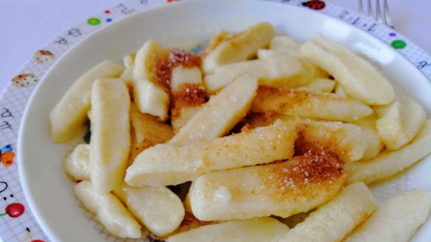 6. Gotowe kluski leniwe polewamy stopionym masłem, posypujemy cukrem z dodatkiem odrobiny cynamonu.
