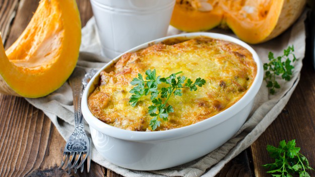 Przygotowanie zapiekanki makaronowej z dynią i sosem serowo-szałwiowym