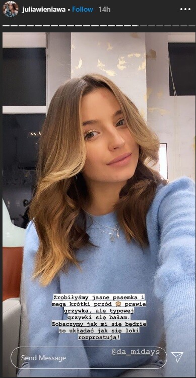 Zrobiłyśmy jasne pasemka i mega krótki przód, prawie grzywka, ale typowej grzywki się bałam. Zobaczymy, jak mi się to będzie układać, jak się loki rozprostują – relacjonowała na swoim InstaStory.