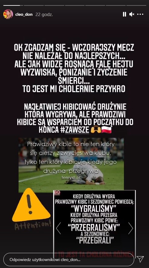 Pod swoim instagramowym wpisem Cleo dołączyła także dwa popularne cytaty związane z kibicowaniem.