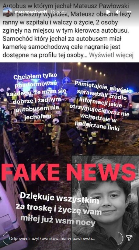 Mateusz Pawłowski natychmiast zdementował fake newsa, pisząc na instagramowej relacji: