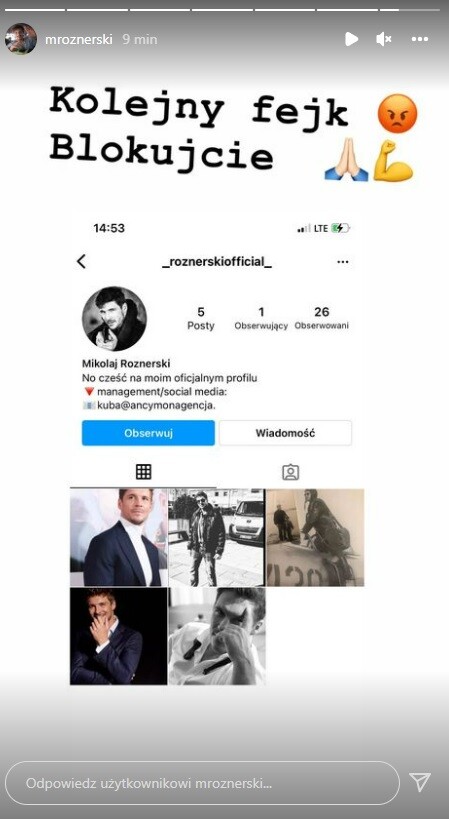 Na pierwszy rzut oka nieprawdziwy profil Mikołaja Roznerskiego praktycznie nie różni się od tego, którym rzeczywiście posługuje się aktor – informacje zamieszczone w opisie są takie same! Niewiele różni się także sama nazwa konta, z której usunięto literę „m”, a wzbogacono o dopisek „official” i dwa dodatkowe znaki na początku i na końcu. Uwagę internautów wzbudzić może jednak zarówno liczba opublikowanych postów, jak i informacje na temat obserwowanych profili: jest ich bowiem dużo mniej, niż na oficjalnym profilu aktora.