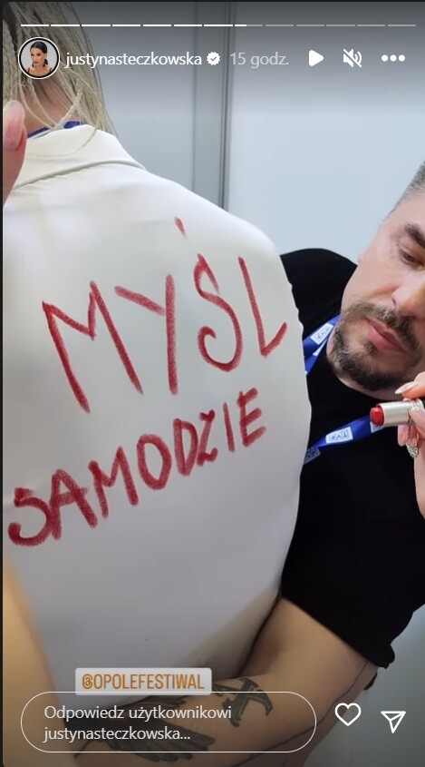 W dodanej reakcji w swoim profilu w mediach społecznościowych Justyna Steczkowska pokazała kulisy przygotowań do koncertu. Na jednym z kadrów można dostrzec, jak osoba z ekipy piosenkarki bierze do ręki czerwoną szminkę. Następnie pisze nią na plecach artystki. Wiele wskazuje na to, że hasło z koszuli wokalistki zapisze się w historii opolskiego festiwalu.