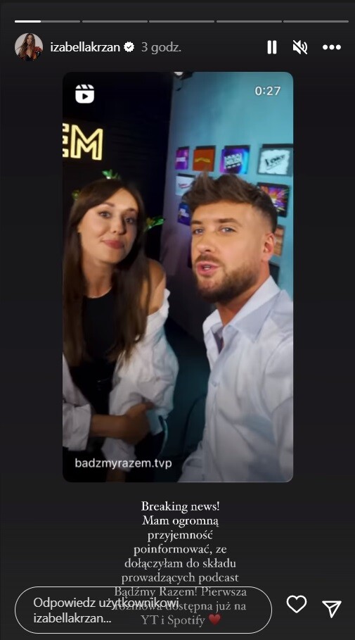 Breaking news! Mam ogromną przyjemność poinformować, że dołączyłam właśnie do składu prowadzących podcast „Bądźmy razem”. Pierwsza rozmowa już dostępna – przekazała w instagramowej relacji na żywo prezenterka.