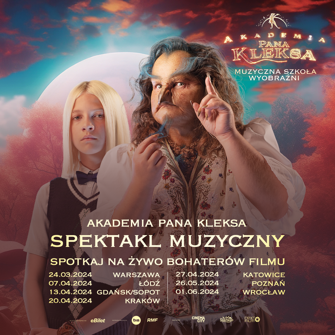 Wielkimi krokami zbliża się premiera spektaklu muzycznego "Akademia Pana Kleksa na żywo – Muzyczna Szkoła wyobraźni". Już 24 marca 2024 roku w Warszawie rozpocznie się trasa, która zawita również do Łodzi, Trójmiasta, Krakowa, Katowic, Poznania i Wrocławia. Na scenie zobaczymy aktorów znanych z najnowszej filmowej adaptacji "Akademii Pana Kleksa", takich jak Tosia Litwiniak, Daniel Walasek, Konrad Repiński i Jana Jachimek.
