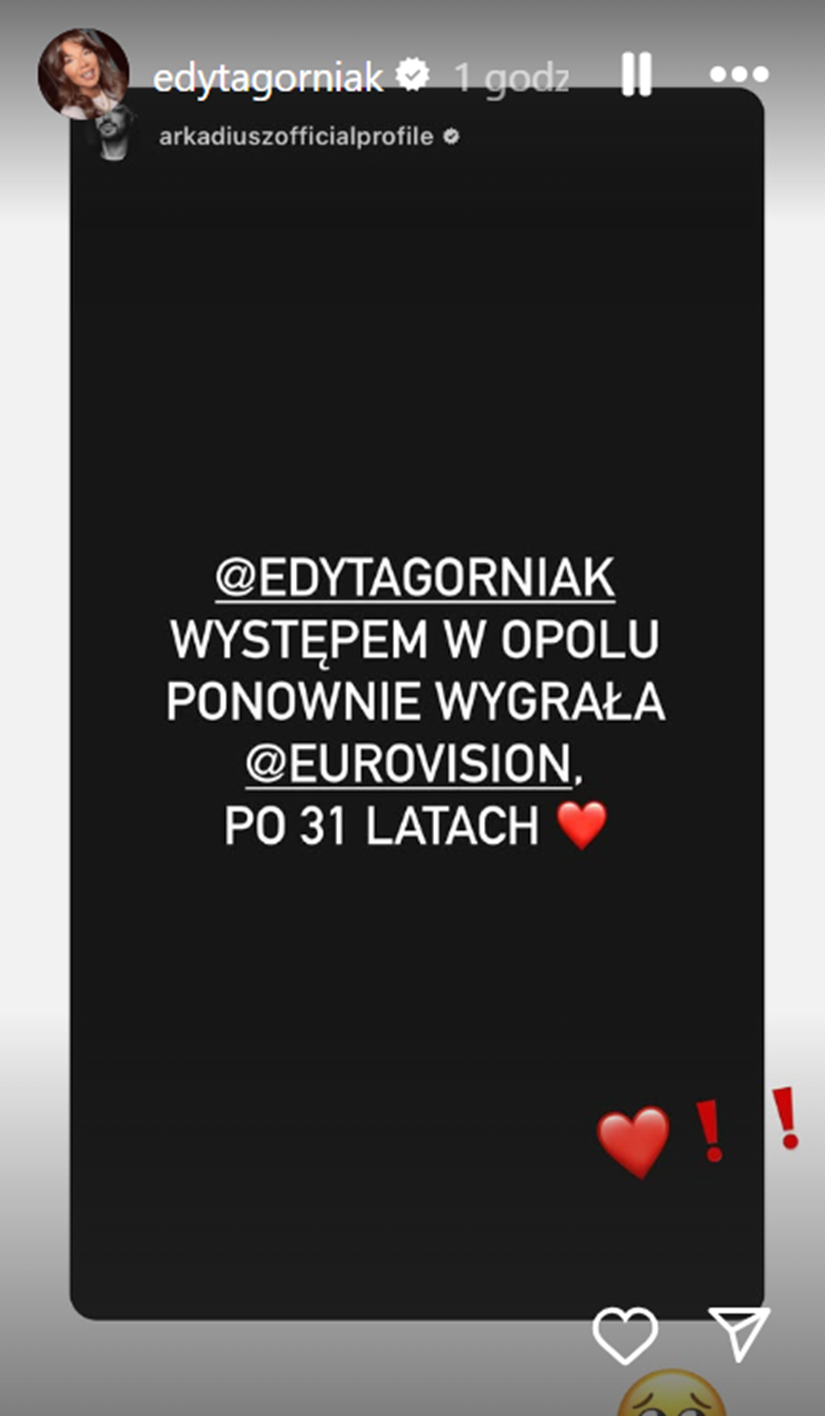 Wokalistka udostępniła na swojej relacji ten wpis i opatrzyła go wzruszoną emotikoną. Przypomnijmy, że z utworem „To nie ja” w 1994 roku zajęła drugie miejsce na Eurowizji. To najwyższy wynik w historii polskich startów.