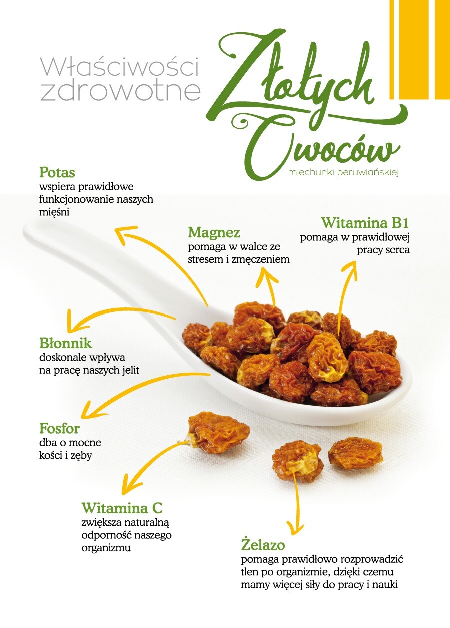 Złote Owoce stanowią bogactwo mikroelementów, niezbędnych do prawidłowego funkcjonowania naszego organizmu. Witaminy z grupy C zwiększają odporność, przyczyniając się do zmniejszenia uczucia zmęczenia i znużenia, zwłaszcza w trakcie intensywnej aktywności fizycznej. Wysoka zawartość potasu reguluje pracę układu nerwowego oraz pozwala kontrolować odpowiednie ciśnienie krwi. Złote owoce to również źródło fosforu, który pomaga w utrzymaniu zdrowych kości i zębów. Miechunka peruwiańska zawiera również więcej żelaza niż szpinak, pozwalając prawidłowo rozprowadzić tlen po organizmie, dzięki czemu mamy więcej siły do pracy i nauki. Złote owoce są również bogate w potas, witaminę B1 i błonnik. Dlatego polecane są osobom wykonującym ćwiczenia, ponieważ dzięki potasowi prawidłowo funkcjonują nasze mięsnie, a krew ma dobre ciśnienie. Zawarta w owocach witamina B1 pomaga natomiast w prawidłowej pracy serca i wspomaga układ nerwowy. Bogactwo błonnika idealnie sprawdzi się u osób stosujących dietę, ponieważ będzie on regulował pracę naszych jelit. Miechunka jest również doskonałym źródłem żelaza, magnezu i fosforu. To składniki dzięki którym mamy więcej siły do nauki i pracy, a także zyskujemy większą odporność i walczymy ze stresem i zmęczeniem.