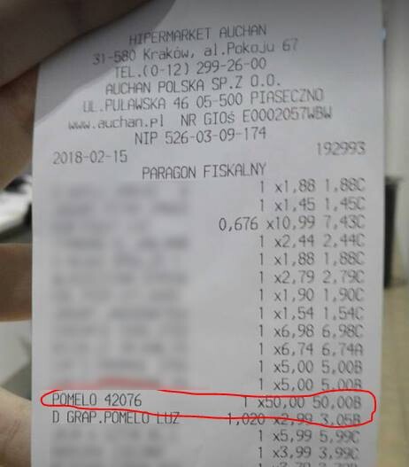 Choć często nie zwracamy uwagi na paragony, zostawiając je przy kasie lub wyrzucając tuż za nią, ta sytuacja pokazuje, że warto jednak dokładnie sprawdzić rachunek. Przynajmniej jeśli nie jesteśmy miliarderami i hurtowo nie kupujemy pomelo za 50 złotych za sztukę. Właśnie tyle w hipermarkecie Auchan w krakowskiej galerii M1 zapłacił jeden z klientów, który na całe szczęście zauważył nieprawidłowość i w porę zainterweniował.