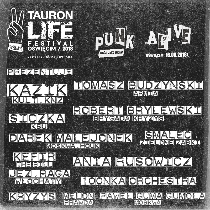 Kazik Staszewski, Darek Malejonek, Robert Brylewski - to tylko część składu, jaki wystąpi na koncercie Punk Alive w ramach TLFO 2018, 16 czerwca na stadionie MOSiR w Oświęcimiu. To wielka gratka dla fanów polskiego niezależnego rocka, zwłaszcza że do 1000 pierwszych biletów organizatorzy bezpłatnie dołączają winyl z limitowanej edycji!