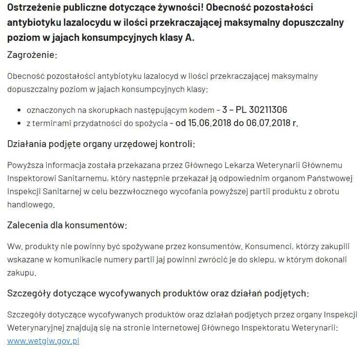 Główny Inspektorat Sanitarny i Inspekcja Weterynaryjna zdecydowała o wycofaniu z rynku ponad czterech milionów jaj kurzych. Inspekcja odkryła w nich pozostałości antybiotyku o nazwie lazalocyd - substancji stosowanej w leczeniu kurcząt. Jego ilość przekracza maksymalny dopuszczalny poziom – nie należy ich spożywać. Klienci, którzy mają już w swoich domach jaja z zarażonej partii powinni zwrócić je do sklepu.