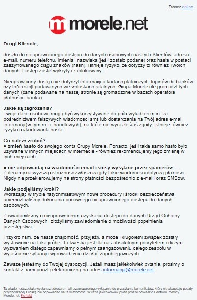 Sklep Morele.net rozesłał dziś w nocy do swoich klientów mail z informacją o wycieku danych. Oświadczenie pojawiło się także na stronie internetowej sklepu. Czytamy w nim, że w niepowołane ręce mogły trafić dane osobowe klientów, takie jak: maile, numery telefonów, imiona i nazwiska (jeśli zostały podane) oraz hasła w postaci zaszyfrowanego ciągu znaków (hash). Morele.net zapewnia, że bezpieczne są natomiast informacje o kartach płatniczych, loginach do banków, czy wnioskach ratalnych, które znajdują się w innych bazach danych. W oświadczeniu czytamy także, że nieuprawniony dostęp został już przez nich zablokowany. Sklep powiadomił również Urząd Ochrony Danych Osobowych i złożył zawiadomienie o możliwości popełnienia przestępstwa. Zaleca jednak klientom zmianę hasła, jeżeli były używane też do innych kont oraz zwiększenie ostrożności w przypadku otrzymania podejrzanych maili lub wiadomości SMS.