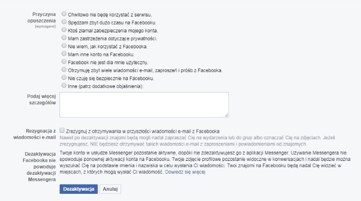 Konto będzie wówczas "zamrożone". Dla znajomych i innych użytkowników będzie nieaktywne, a my będziemy mieli szansę wrócić do niego, gdy poczujemy taką potrzebę.