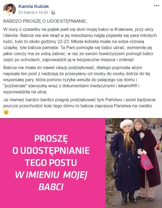 W nocy z czwartku na piątek palił się dom mojej babci w Krakowie, przy ulicy Ułanów. Babcie nie wie skąd w jej mieszkaniu naglę pojawiła się para młodych ludzi, było to około godziny 22-23. Młoda kobieta miała na sobie różową czapkę, tyle babcia pamięta. Ta Pani pomogła się babci ubrać, wymieniła jej jakie rzeczy ma ze sobą zabrać, w raz ze swoim towarzyszem pomogli babci zejść po schodach, zaprowadzili ją w bezpieczne miejsce i zniknęli - czytamy w poście.