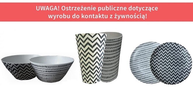 W próbkach produktu badanego w Niemczech, stwierdzono podwyższone poziomy migracji formaldehydu i melaminy z naczyń o wzorze, którego zdjęcie załączono do komunikatu
