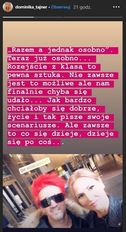 Michał Wiśniewski i Dominika Tajner pobrali się siedem lat temu. Wczoraj ich małżeństwo oficjalnie się zakończyło, o czym poinformowała była już żona lidera grupy Ich Troje na swoim InstaStories: