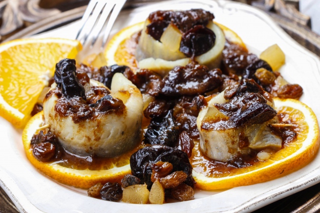 Ruloniki śledziowe układamy na półmisku na plasterkach pomarańczy i zalewamy sosem z powidła. Całość dekorujemy świeżą natką pietruszki.