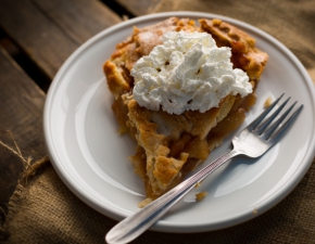 8. Mniejszą część ciasta kruchego rozwałkowujemy na grubość kilku milimetrów i tniemy w paski o szerokości palca. Na jabłkowym nadzieniu z pasków układamy "kratkę".
