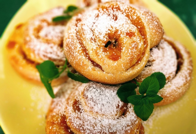 12. Gotowe bułeczki drożdżowe z marmoladą morelową posypujemy cukrem pudrem albo lukrujemy.