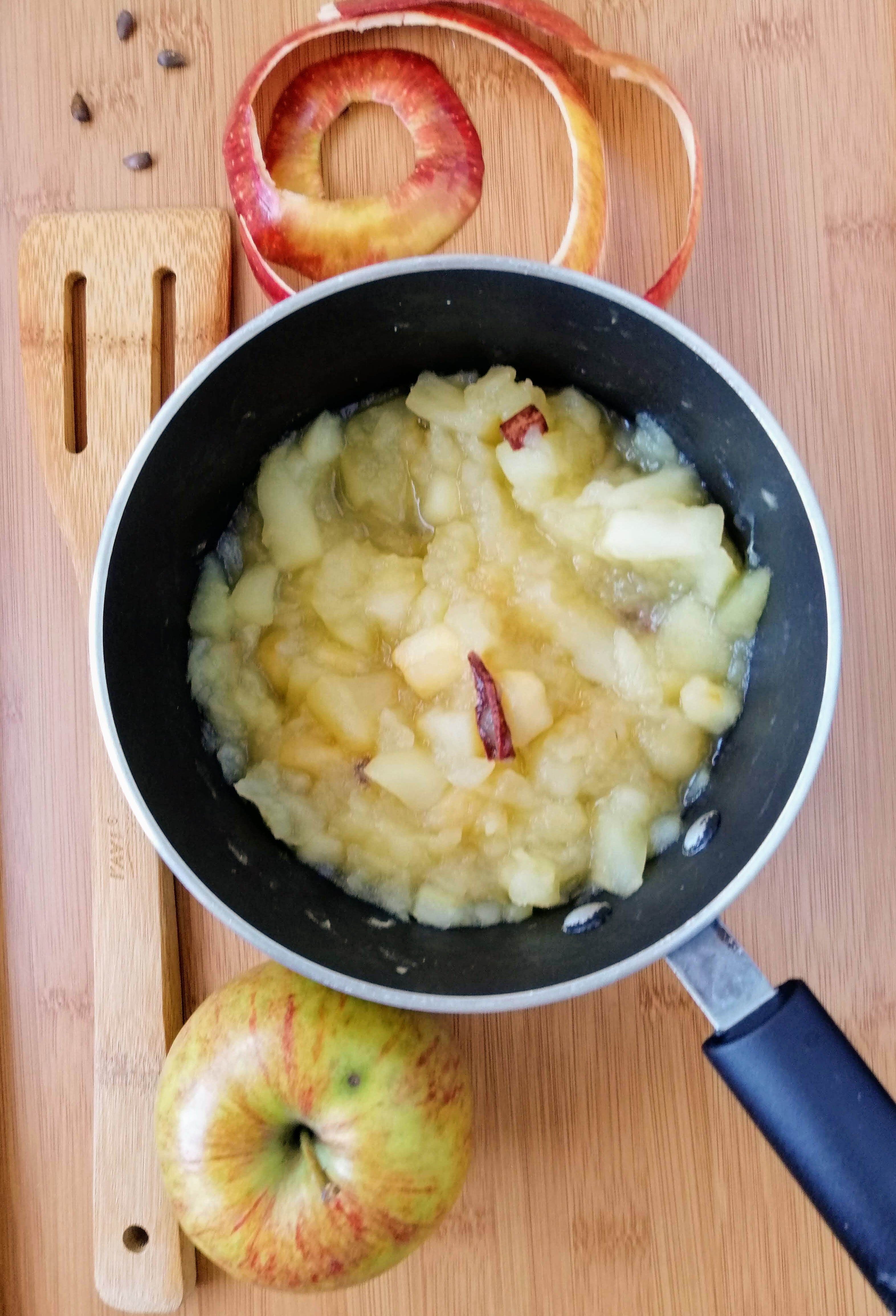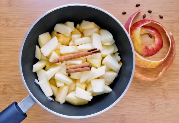 Następnie kroimy na kawałki mniej więcej tej samej wielkości. Resztki owoców można wykorzystać do przygotowania domowego octu jabłkowego. W rondlu podgrzewamy ok. pół szklanki wody i wrzucamy jabłka z cynamonem. Wszystko dusimy przez ok. 5 minut.