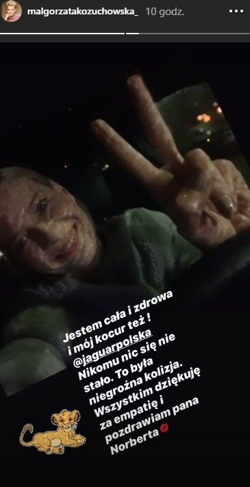 Gdy do mediów dotarła informacja o kolizji Małgorzaty Kożuchowskiej, aktorka postanowiła zabrać głos w tej sprawie. Do całej sytuacji odniosła się za pośrednictwem Instagrama, publikując relację na InstaStories. Zamieściła tam zdjęcie, na którym pozuje uśmiechnięta, za kierownicą swojego samochodu. Uspokoiła fanów i pozdrowiła „pana Norberta”, najprawdopodobniej kierowcę mercedesa.