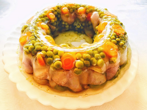 7. Na półmisku, w silikonowej foremce lub w specjalnej formie do galaret układamy warstwami wszystkie składniki. Na spód najlepiej ułożyć plasterki marchewki, na boki ćwiartki lub ósemki jajek, a przestrzenie pomiędzy wypełniamy szynką z chrzanem i groszkiem.