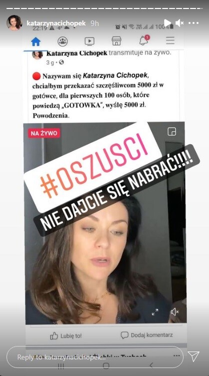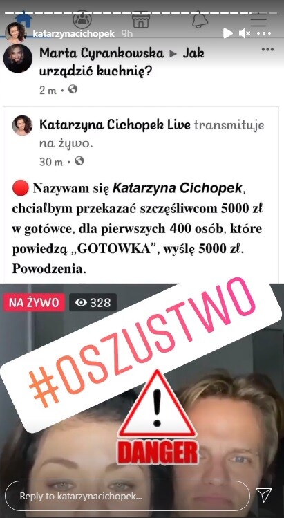 Katarzyna Cichopek-Hakiel natychmiast zareagowała, ostrzegając swoich fanów przed oszustwem. Aktorka opublikowała na swoim InstaStory kadry ukazujące działania internetowych złodziei. Apelując o ostrożność, gwiazda poprosiła, by internauci byli czujni i nie dali się nabrać.