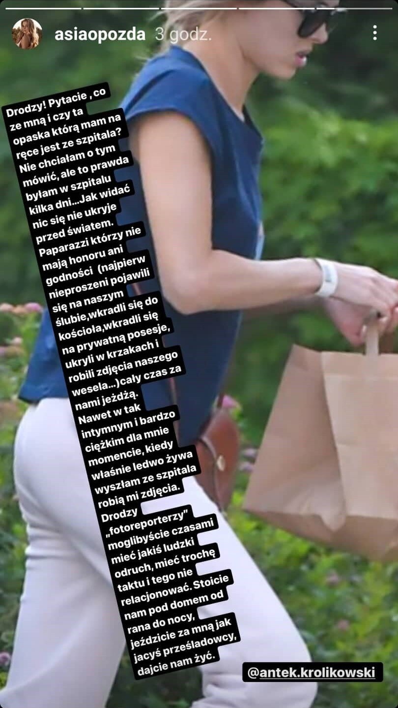 Joanna Opozda postanowiła zabrać głos w sprawie obecności fotoreporterów na jej ślubie z Antkiem Królikowskim. Skłoniły ją do tego ostatnie wydarzenia. Aktorka za pośrednictwem swojego intagramowego profilu wyznała, że niedawno trafiła do szpitala. Spędziła tam kilka dni. Zaraz po tym, jak opuściła placówkę, znów osaczyli ją paparazzi. Na zrobionych przez nich zdjęciach na nadgarstku 33-latki widać charakterystyczną opaskę, o którą zaczęli dopytywać fani.