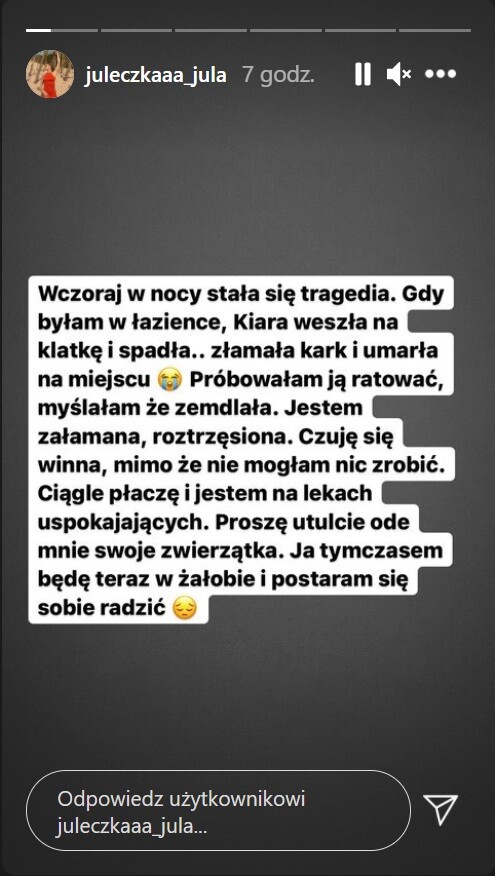Wczoraj stała się tragedia. Gdy byłam w łazience, Kiara wspięła się po klatce i upadła, skręcając kark. Zmarła na miejscu. Jechałam do weterynarza, myślałam, że może zemdlała, trzymałam ją na rączkach płacząc i prosząc, by nie odchodziła. Bo jeszcze za szybko, bo miała dopiero roczek. Czuję się tak okropnie, jestem załamana, na lekach uspokajających, ciągle płaczę i chcę ją przytulić – napisała.