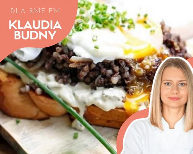 5. Na kromki chałki nałóż po jednej łyżce sosu tatarskiego, na to kaszankę, zrób w niej małe zagłębienie i ułóż na nim jajko.