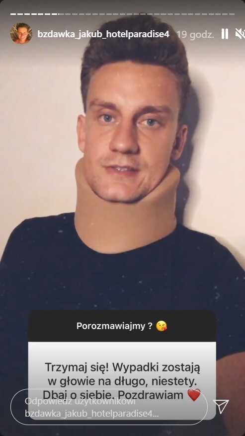 Jakub Bzdawka, którego telewidzowie znają z czwartej edycji „Hotelu Paradise”, miał wypadek samochodowy. 30-latek, który na co dzień pracuje w agencji eventowej, a ponadto jest specjalistą ds. przygotowywania inwestycji i sędzią piłkaraskim, o wszystkim poinformował za pośrednictwem Instagrama. Wrzucając tam zdjęcie, na którym ma założony kołnierz ortopedyczny, napisał:
