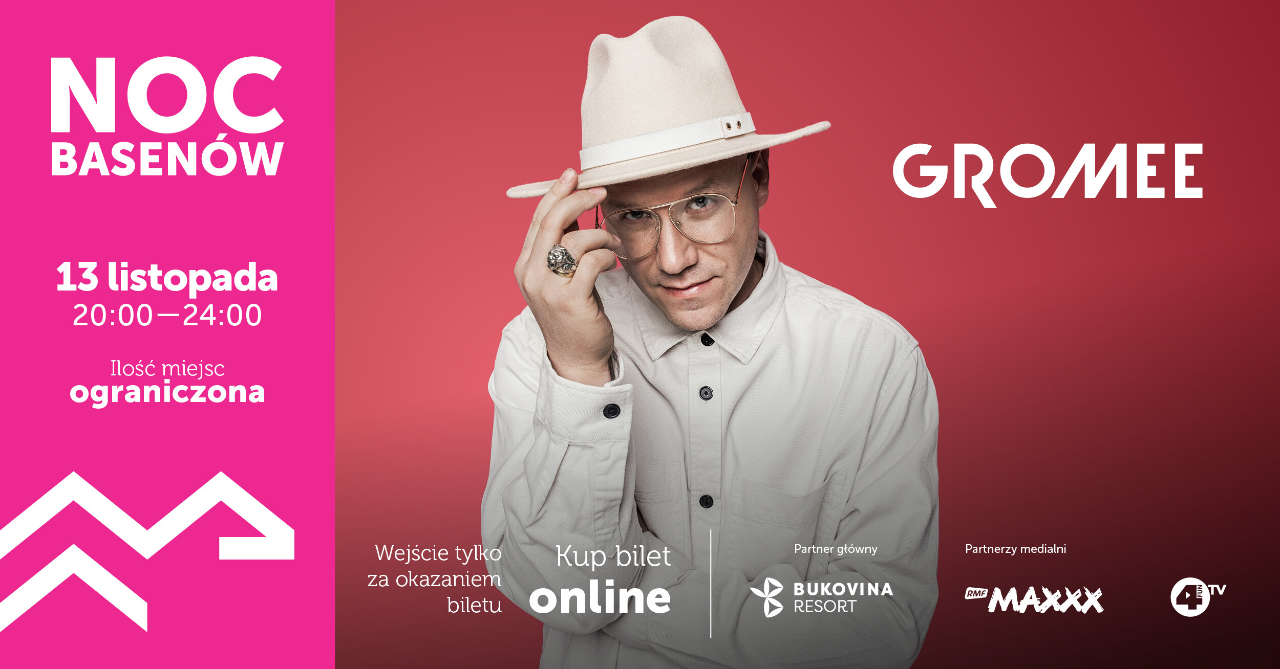 Noc Basenów to cykliczne klubowe show. 13 listopada gwiazdą imprezy będzie Gromee, jeden z najpopularniejszych producentów muzycznych, DJ tworzący głównie muzykę dance, pop, house i EDM. Od kilku lat współpracuje z największymi studiami na świecie, a w jego solowym projekcie śpiewało wielu wybitnych artystów.