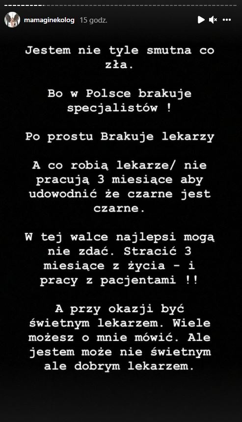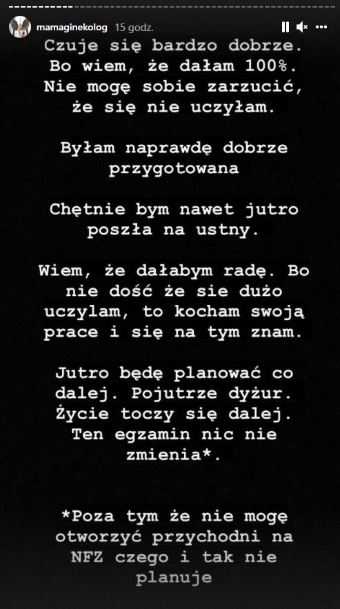 Gdy silne emocje zaczęły powoli opadać, Mama Ginekolog zamieściła kolejne obszerne InstaStories. Gwiazda Internetu opowiedziała w nim, że smuci ją sytuacja lekarzy w Polsce. Nicole stwierdziła, że w naszym kraju brakuje specjalistów, a nawet najlepsi nie są czasem w stanie zdać wymagających egzaminów. Dodała też, że niezdany test na specjalizację nie zmienia niczego w jej życiu, bowiem negatywny wynik nie pozwala jej jedynie na otwarcie przychodni na NFZ, czego Nicole w ogóle nie planowała.