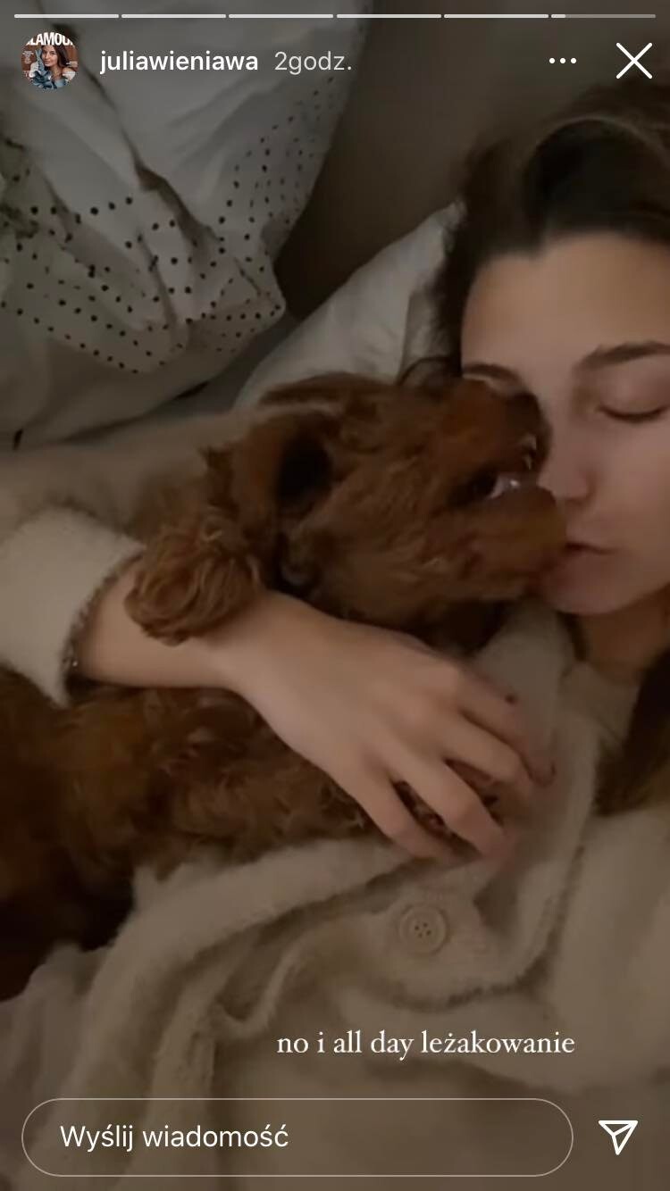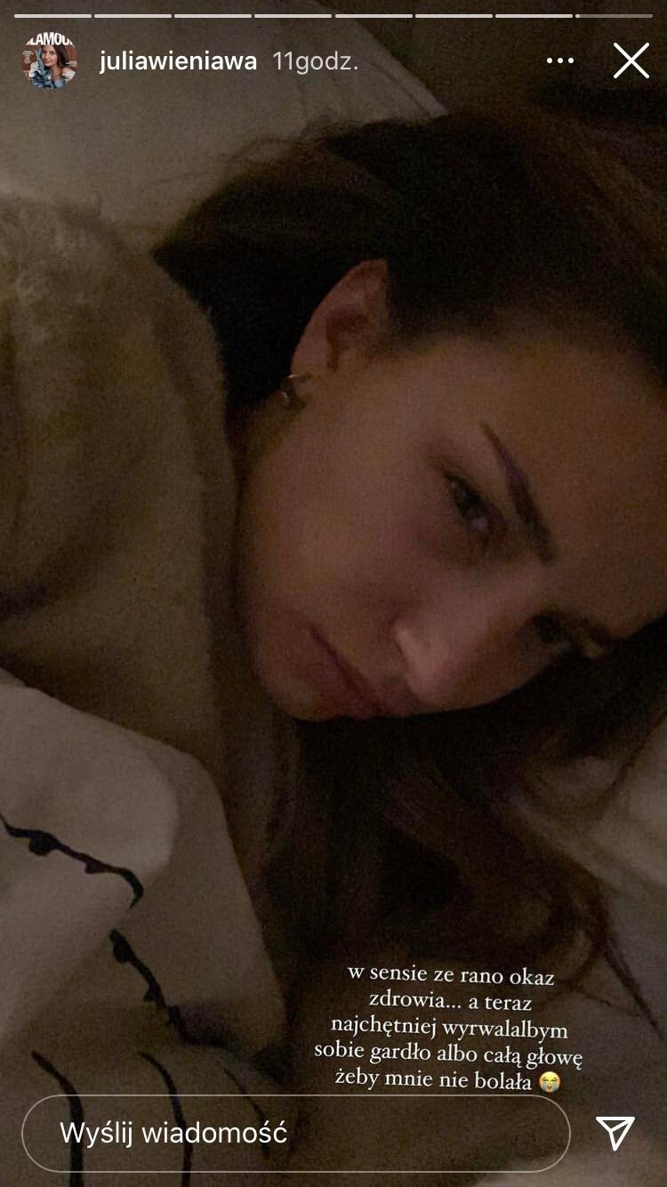 Julia Wieniawa na bieżąco relacjonuje kulisy swojego życia codziennego, a jej profil na Instagramie z wypiekami na twarzy śledzą 2 miliony osób. Młoda aktorka nie zwalnia tempa i angażuje się w coraz to kolejne projekty. Przyszedł jednak czas, w którym musi na chwilę odpuścić ten zawodowy pęd i całkowicie skupić się na sobie. Na jej InstaStories pojawiły się krótkie nagrania, na których w ciemnym pokoju artystka leży w łóżku w swetrze. Jej wyraz twarzy przywodzi na myśl lekkie zaniepokojenie. Jak jeszcze wczoraj, tj. 18.01.2022 roku, przyznała, nie czuje się najlepiej.