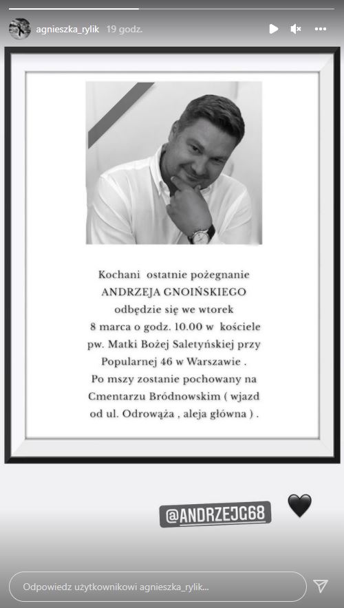 Agnieszka Rylik przekazała również za pośrednictwem Instagrama szczegóły ceremonii pogrzebowej. Andrzej Gnoiński zostanie pochowany we wtorek, 8 marca 2022 roku, o godz. 10:00. Ceremonia pogrzebowa odbędzie się w kościele pw. Matki Bożej Saletyńskiej przy Popularnej 46 w Warszawie.