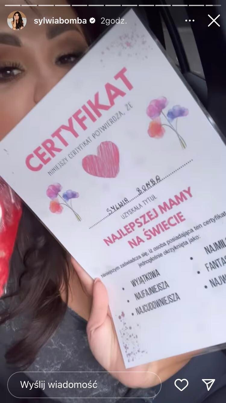 Sylwia Bomba przyznaje, że pokazując te fotografie, sama ma łzy w oczach. Zwraca uwagę, że córka to mała dama, która nadała wszystkiemu sens. Z okazji święta, przypadającego na dzień 26.05, otrzymała „Certyfikat najlepszej mamy na świecie”.