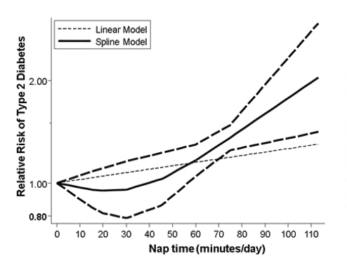 Zbyt długa jednak może doprowadzić do cukrzycy typu 2. Poniższy wykres obrazuje względne ryzyko zachorowania na tę chorobę w zależności od długości trwania drzemki.