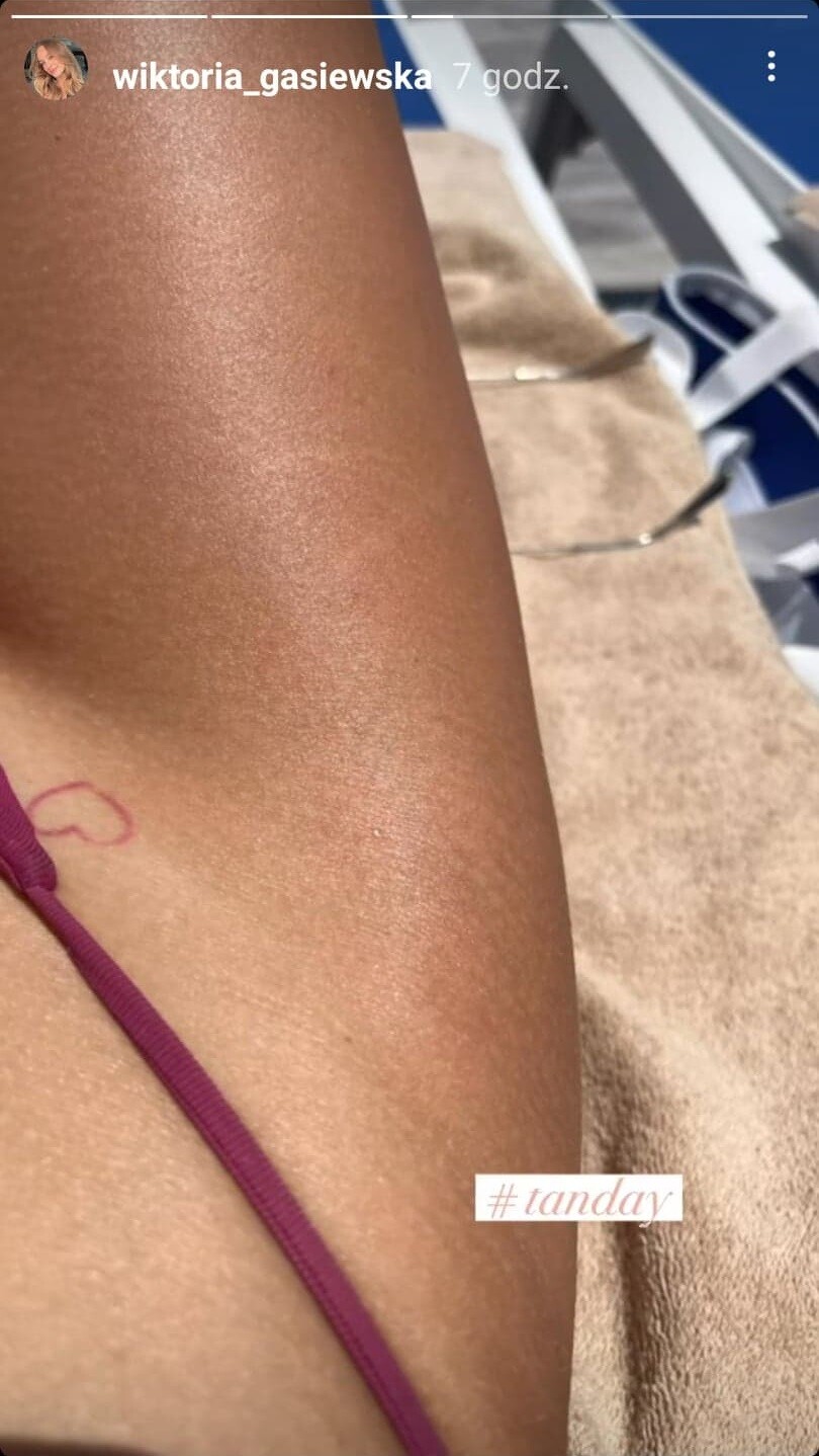 Okazuje się, że młoda aktorka wytatuowała sobie na pachwinie symbol serca. Nie jest to jedyna ozdoba na ciele Wiktorii Gąsiewskiej. Na żebrach, tuż pod biustem, dumnie nosi napis „Angel”, czyli „Anioł”. Kolejny wzór ma na plecach.