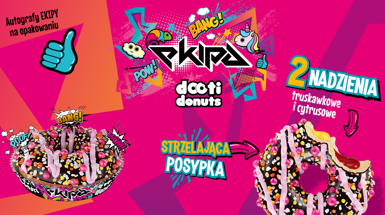 W marcu tego roku do sklepów trafił kolejny smakołyk internetowych twórców – Donuty Ekipy. Teraz, po kilku miesiącach obecności tego produktu na rynku, influencerzy zdecydowali się wprowadzić słodką nowość. Donut Ekipy pojawił się w sklepach w nieznanym dotąd smaku: truskawkowo-cytrusowym. Nowe wydanie słodyczy od youtuberów można już kupić w Biedronce. Na fanów czeka też duża niespodzianka, bo na opakowaniu Donutów znalazły się autografy obecnych członków Ekipy i Genzie – autorskiego projektu Friza.