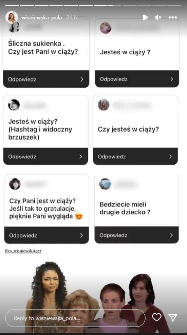 Pola Wiśniewska, która od stycznia zeszłego roku jest również Mamą Falco Amadeusa (piątego dziecka Wiśniewskiego), coraz chętniej otwiera się przed internautami, publikując w sieci rozmaite kadry. Ostatnio zorganizowała sesję „pytań i odpowiedzi”, zaspokajając ciekawość użytkowników sieci. Wśród zapytań pojawiły się m.in. kwestie odnoszące się do ślubnej kreacji, a także do… kolejnego dziecka! Jak się okazało, sporo internautów zwróciło uwagę na wygląd Poli, pytając wprost o powiększenie rodziny. Wiśniewska zgromadziła pytania na jednej planszy, a w odpowiedzi zamieściła ujęcia zdziwionych kobiet. W taki sposób ukochana lidera Ich Troje postanowiła zareagować na bezpośrednie wpisy.