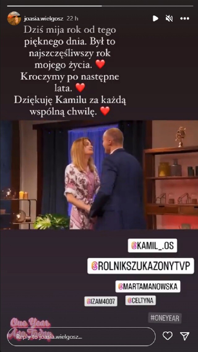 Od wzruszającego momentu minęło już 12 miesięcy, podczas których wydarzyło się naprawdę sporo. Joanna i Kamil niedawno obwieścili światu, że spodziewają się dziecka! W oczekiwaniu na powiększenie rodziny Joanna z 8. edycji „Rolnika…” powróciła pamięcią do momentu zaręczyn, publikując na InstaStory prywatny wpis.