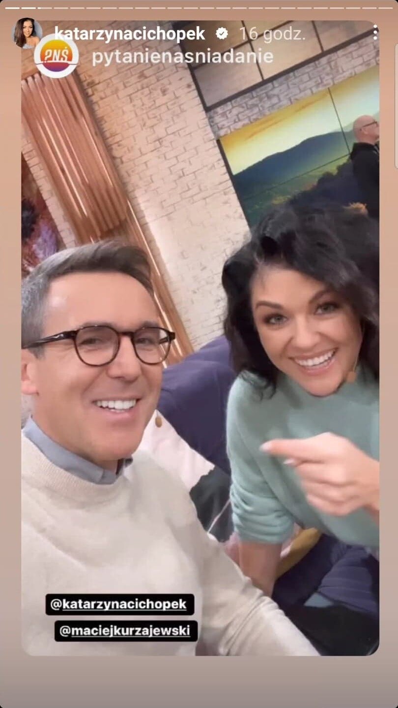 Choć zakochani z „Pytania na śniadanie” ostatnimi czasy unikali pokazywania się razem poza anteną, w weekend zrobili pewien wyjątek. W niedzielę, będąc w studiu programu śniadaniowego Dwójki, nagrali krótki film z wiadomością do fanów. Cichopek i Kurzajewski zaprosili telewidzów na kolejne rozmowy z gośćmi, sypiąc przy tym tematami jak z rękawa. Wideo zostało opublikowane na instagramowym profilu „PnŚ”, potem Kasia udostępniła je u siebie.