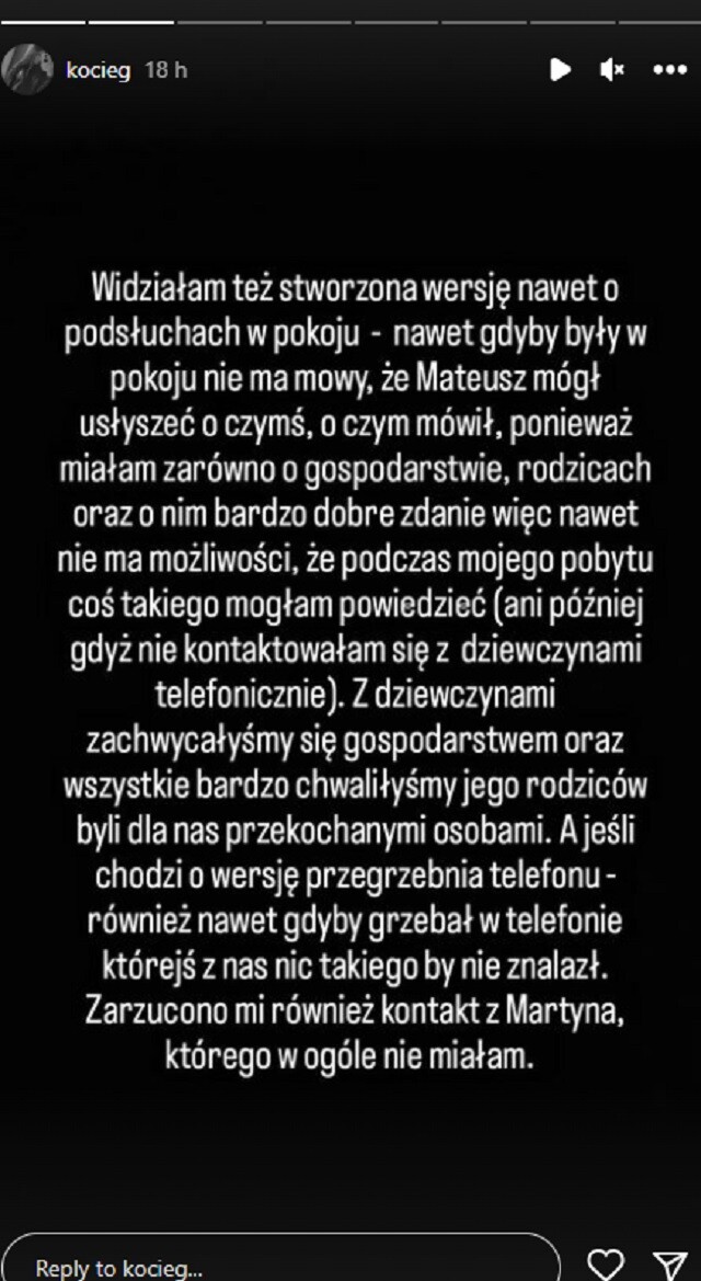 (…) Widziałam też stworzoną wersję nawet o podsłuchach w pokoju – nawet gdyby były, nie ma mowy, że Mateusz mógł usłyszeć o czymś, o czym mówił, ponieważ miałam zarówno o gospodarstwie, rodzicach oraz o nim bardzo dobre zdanie, więc nawet nie ma możliwości, że podczas mojego pobytu mogłam coś takiego powiedzieć (ani później, gdyż nie kontaktowałam się z dziewczynami telefonicznie) (…). Zarzucono mi również kontakt z Martyną, którego nie miałam.