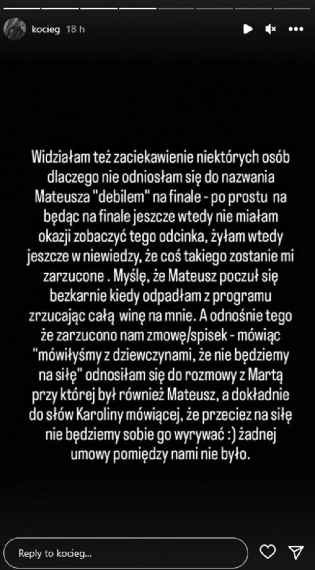 (…) Widziałam też zaciekawienie niektórych osób, dlaczego nie odniosłam się do nazwania Mateusza „debilem” na finale – po prostu będąc na finale jeszcze wtedy nie miałam okazji zobaczyć tego odcinka. Żyłam wtedy jeszcze w niewiedzy, że coś takiego zostanie mi zarzucone. Myślę, że Mateusz poczuł się bezkarnie, kiedy odpadłam z programu, zrzucając całą winę na mnie (…).