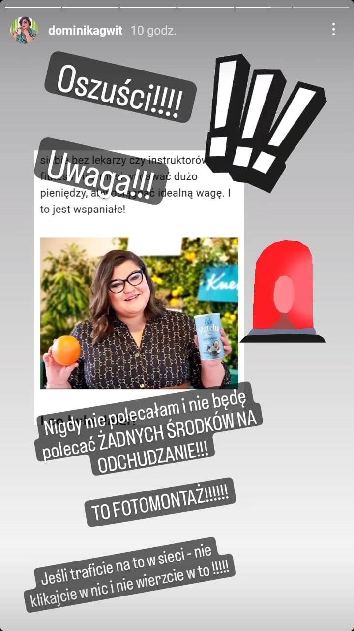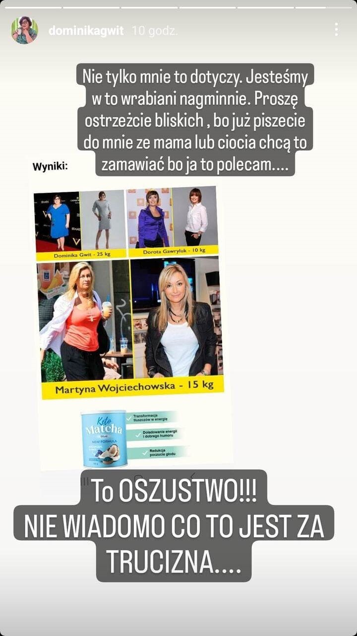 My w ogóle nie wiemy, co to jest za trucizna, nie mamy zielonego pojęcia, a to nas prześladuje. Mówię „nas”, bo nie tylko ja jestem tam na zdjęciach. Wiem, że kiedyś była chyba Beata Tadla, Dorota Szelągowska, widziałam teraz też Martynę Wojciechowską. My jesteśmy wrabiani w to, my tego nie reklamujemy. Ja nigdy nie reklamowałam żadnych proszków na odchudzanie, nie reklamuję i nie będę reklamować – podsumowuje Gwit-Dunaszewska.