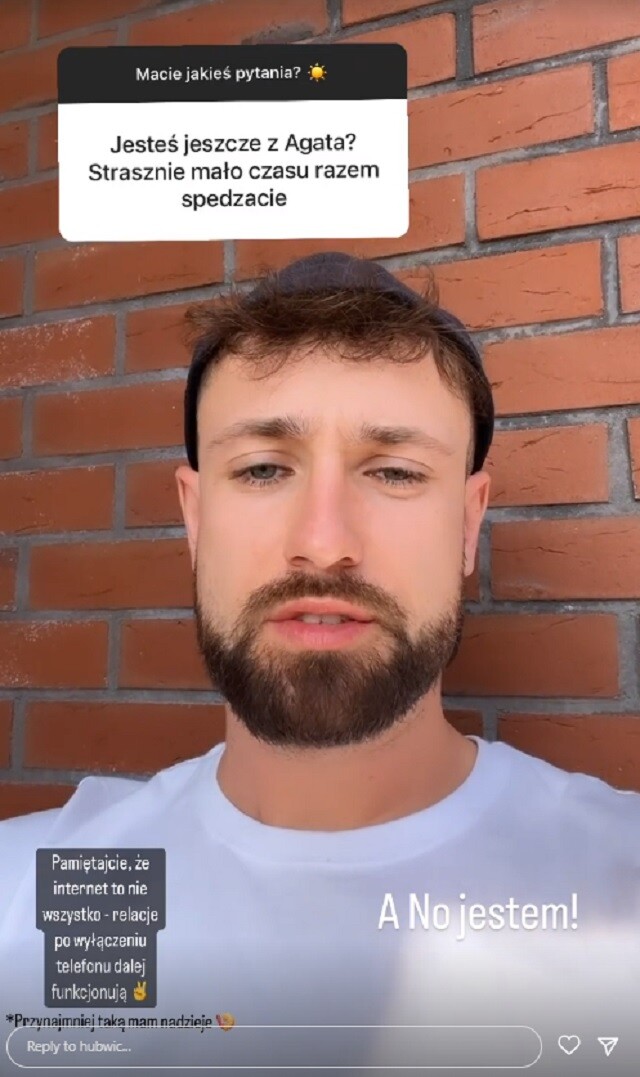 Oczywiście, że jestem z Agatą. Nasz czas spędzany razem w weekend lub w tygodniu jest „policzony”. Chcemy każdą sekundę spędzać razem, ale po prostu nie zawsze jest czas lub miejsce, by wstawiać coś na Instagrama, bo chcemy się nacieszyć sobą – to jedno. A drugie – powstały pewne dywagacje na temat „roszad” tutaj w parach, bo – jak wiemy – jedna para się rozstała. Nie jesteśmy na pewno jedną z tych par (…). Szanujemy swój czas i fajnie, że udało się nam spotkać w ten weekend, bo nie było to takie pewne. Jesteśmy razem szczęśliwi.