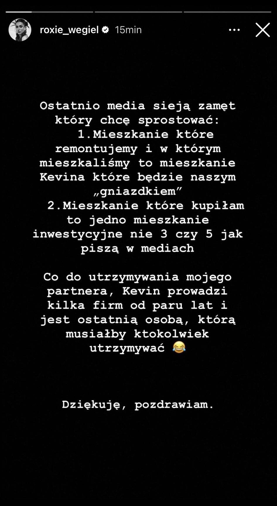 Ostatnio media sieją zamęt który chcę sprostować. 1. Mieszkanie, które remontujemy i w którym mieszkaliśmy, to mieszkanie Kevina, które będzie naszym „gniazdkiem”. 2. Mieszkanie, które kupiłam, to jedno mieszkanie inwestycyjne – nie 3 czy 5, jak piszą w mediach – wyjaśniła kwestię wspólnego mieszkania.