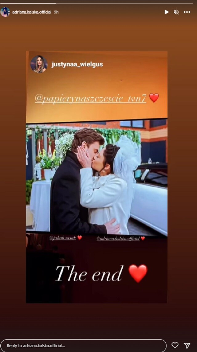 Adriana Kalska w serialu: „Papiery na szczęście” stworzyła elektryzujący duet z Jakubem Sasakiem, czyli serialowym Adamem. Ich relacja miała wiele wzlotów i upadków, a główni bohaterowie musieli walczyć o swoją miłość. Stąd też informacja o ślubie zakochanych w finale sezonu bardzo ucieszyła widzów produkcji. Wcześniej Marta ogłosiła narzeczonemu radosną nowinę o… ciąży! Teraz wszystkie znaki na niebie i ziemi wskazują na to, że Kowalczyk i Wiśniewska zalegalizują swój związek. Na fotografii znalazł się wymowny napis: the end, co zwiastuje zakończenie.